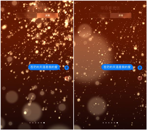之前我們給大家介紹過 iMessage 炫酷的全屏效果,在發送信息的時候,長按住最右側發送小箭頭不放,就可以進入效果選擇,切換到「全屏」,你會看到此處增加了一個名為 Celebration 的效果,當然,動態特效也更加閃瞎狗眼,同時還伴有震動反饋。