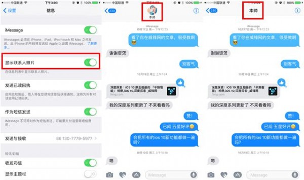 打開「設置 - 信息」,可以看到「顯示聯系人照片」的開關,關掉之後整個信息列表都不再顯示頭像,而短信對話界面頂部也不出現頭像了。