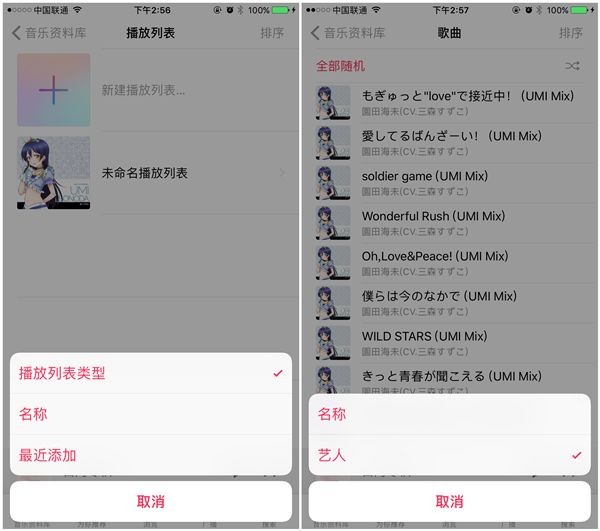 iOS 10.2 公測版的音樂應用中,播放列表和歌曲列表界面都增加了「排序」按鈕,可以各自按照不同的選項進行排序了。另外在「搜索」中,Apple Musice 和音樂資料庫的位置做了調整。
