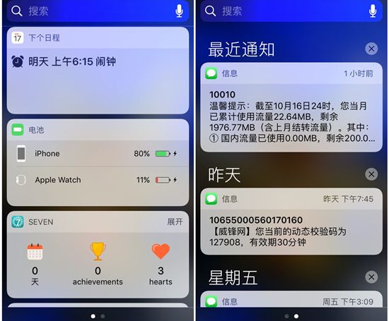 大家還記得iOS9的下拉通知中心分為「今天」和「通知」兩欄,而iOS10新通知中心直接把分欄說明砍了,做成左右滑動兩頁,而左側以往這裡是Spotlight的建議頁面,現在 Spotlight 建議頁面和 Widget 融合在同一頁面(日期也在這裡)。原本存在感較低的Widget小工具,在新通知中心大放異彩。