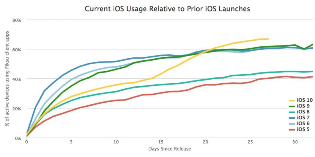 從Fiksu提供的數據圖上我們看到,iOS10在發布一個月內的安裝率比以往的任何一個版本更新都要高。有趣的是,iOS10一開始的成績要落後於iOS6、iOS7和iOS9,但是在20天之後實現了反超,並且在9月底達到了頂點。