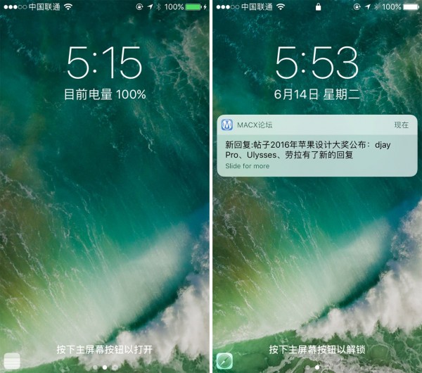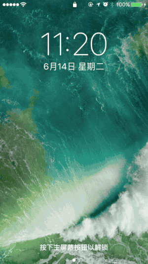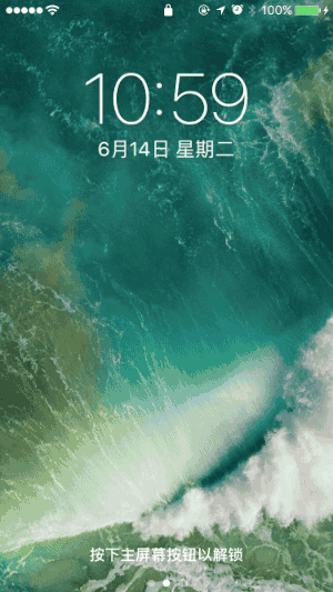 想要解鎖 iPhone 時,按下主屏幕按鈕,也就是 Home 鍵解鎖。這種按下 Home 鍵解鎖也是唯一的解鎖方式。在 iOS 9 中,只要屏幕點亮,將手指放在 Home 鍵上,不需要按下也能解鎖,在 iOS 10 中不可用了,解鎖時必須將 Home 按下。除此之外,向右滑動也無法解鎖設備了,向右滑動可以激活小組件頁面,查看信息和各種小組件內容,向左滑動可以直接進入相機應用,並開始拍照。這些操作邏輯上的改變意味著,今後我們解鎖 iPhone 只能通過按下按鈕,不能使用左右滑動,因為左右滑動可以激活小組件頁面和相機 App。