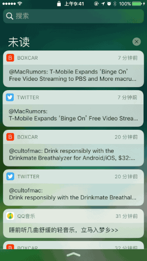iOS 10 中的通知提醒外觀發生了變化,在 iOS 9 中,鎖屏狀態和通知中心中的提醒事項都是深色的半透明處理,與背景融為一體,只能看到通知提醒的文字。在 iOS 10 中,通知提醒的設計與 iOS 6 的風格有些類似,每條提醒都采用圓角矩形設計,顏色清透,而且鎖屏狀態下接收到提醒不會讓鎖屏背景變暗。每條提醒的第一行左側是發出提醒的應用名稱,右側為收到提醒的時間。下方是詳細的通知內容文字,每條通知提醒都是獨立的,而不是像 iOS 9 那樣,融合在一起。在通知中心中,iOS 10 提供了一鍵清空所有通知的功能。