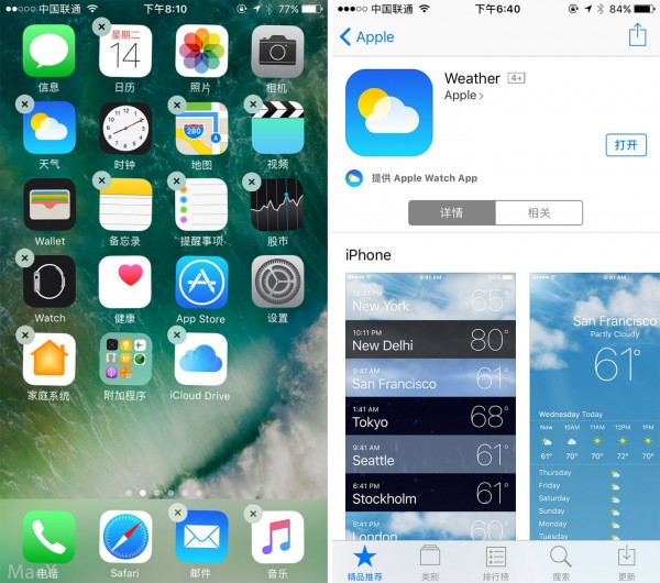 iOS 10 之前的版本中,用戶抱怨最大的就是 iOS 預載的很多應用無法刪除,而且預載應用的數量也越來越多。比如提示應用、iBooks 應用、Apple Watch 應用等。有些應用使用頻率太低,比如視頻應用等。iOS 10 中終於加入了刪除預裝應用的功能,除了系統核心應用不能刪除外,其余的應用都可以自由刪除。核心應用包括電話、信息、Safari 和 App Store 等。蘋果已經將可以刪除的應用上架 App Store,如果之後想要再次使用,通過 App Store 下載即可。下面是 iOS 10 中可以刪除的應用列表: