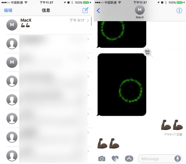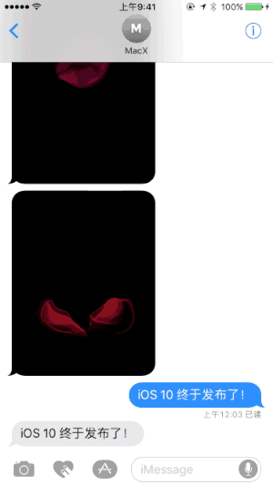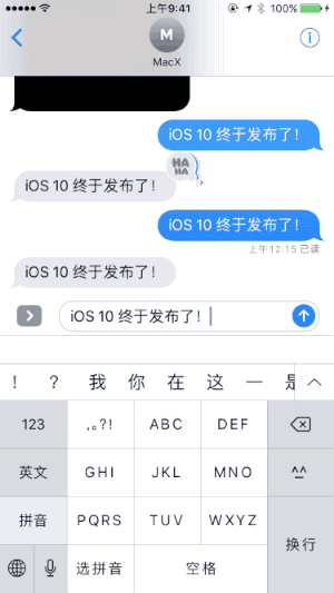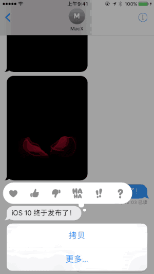iOS 10 的信息應用還支持 Tapback 功能,無論是別人發送過來的信息,還是自己發送過去的信息,長按信息氣泡後會出現耳機菜單,菜單中有6個圖標包括愛心、點贊、踩、HAHA、歎號和問號。這些表情可以反映我們對信息的態度,非常人性化。除了 Tapback,iOS 10 信息應用還支持帶效果發送,效果分為氣泡效果和屏幕效果。
