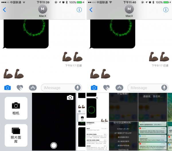iOS 10 中對信息應用的 iMessage 功能進行了大幅增強,雖然界面上的變化並不大,依然是藍色氣泡,但增加了大量的特效和Apple Watch 上的 Digital Touch 功能。我們可以看到輸入欄左側新增加了三個按鈕:相機、Digital Touch 和應用擴展。點擊相機功能後,可以直接拍攝照片或發送圖片庫中的照片。iOS 10 中的這個功能進行了進一步優化,不需要進入另一個相機界面,實時的相機取景窗口與圖片庫中的照片在一起,這樣開啟之後可以直接照相,或者選擇最近拍攝的照片。