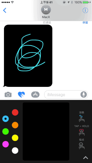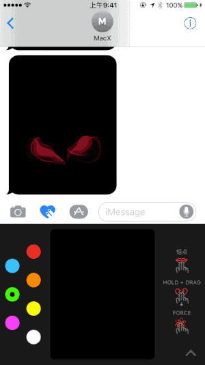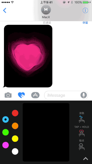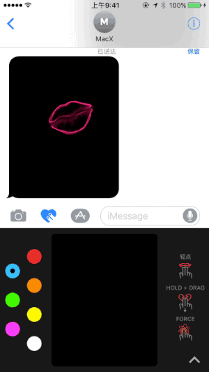 iOS 10 的 Digital Touch 功能比 Apple Watch 上的 Digital Touch 功能更多更好玩。想要使用這項功能時,點擊對話窗口左下角的 Digital Touch 按鈕。這時屏幕下方會變成 Digital Touch 鍵盤,左側有7顆彩色的圓點,這時塗鴉顏色選擇,點擊後在中間黑色的地方可以進行塗鴉和畫圈。右側是工具選擇,iOS 10 中的 Digital Touch 玩法很多劃線就是塗鴉,雙指長按就是發送心跳,輕點就是發送圓圈。點擊工具後,可以看到更多的功能,雙指輕點就是發送嘴唇,雙指長按並向下滑動是發送心碎。