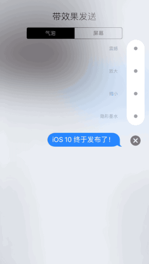 氣泡效果分為震撼、放大、縮小和隱形墨水。屏幕效果分為含氣球的信息、含五彩紙屑的信息、含激光的信息、含焰火的信息和含流行的信息。想要使用效果時,文字輸入完成後,長按發送按鈕即可進入效果選擇界面。下面是各種效果的演示。