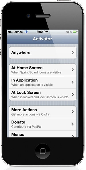 Activator是一個非常強大的輔助工具,它自帶了種類繁多的功能設置,你可以通過手勢(如雙擊狀態欄、晃動設備等)來觸發特定事件(如模 擬Home鍵、打開多任務管理器等)。難能可貴的是,有非常多的工具與Activator相兼容,善加利用搭配眾多的工具才能使它發揮出最大的功 效。該插件完美支持所有iOS設備,可在BigBoss源免費下載。