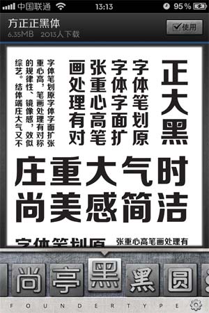使用PP助手或者iFunbox等帶文件管理功能的工具,打開目錄/System/Library/Fonts/Cache,之後下面的窗口將會顯示很多系統上安裝的字體,其中STHeiti-Light 和 STHeiti-Medium對應的是中文字體, _H_HelveticaNeue(或者是HelveticaNeue)對應的是英文字體,LockClock 對應的是鎖屏桌面和時間顯示的字體,然後把自己喜歡的字體改成對應字體文件的名字替換進去即可,重啟生效!
