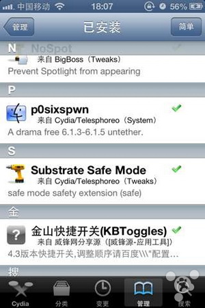 然後關機再開機就 OK 了,不過目前論壇很多鋒友反應關機之後會卡在白蘋果,估計和不完美越獄狀態下安裝了某些插件有關,大家可以嘗試 HOME 鍵+長按開機鍵強制重啟,iH8sn0w 大神正在修復這個 BUG,白蘋果們可以耐心等待一下。