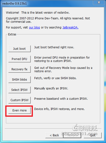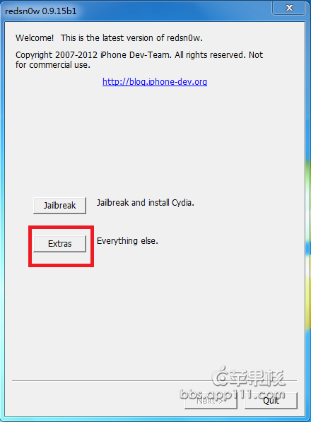2、成功進入DFU模式之後,打開紅雪選擇“其他(Extras)”: