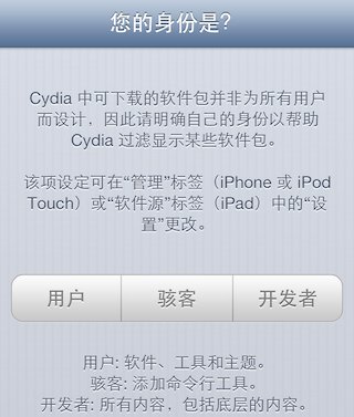 重啟後再次進入Cydia,選擇用戶身份(小白選擇用戶即可)