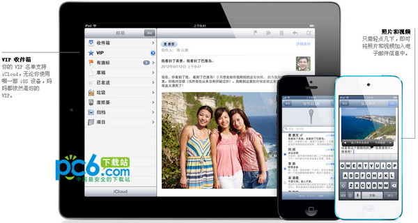 iOS 6 裡的郵件 app 經過重新設計,界面更加簡潔流暢,讓閱讀和編寫郵件更輕松。你可設置自己的 VIP 名單,這樣就不會錯過來自客戶、老板或摯友的重要信息。為電子郵件添加照片和視頻也更容易。若要刷新你的郵箱,只需向下輕掃即可。