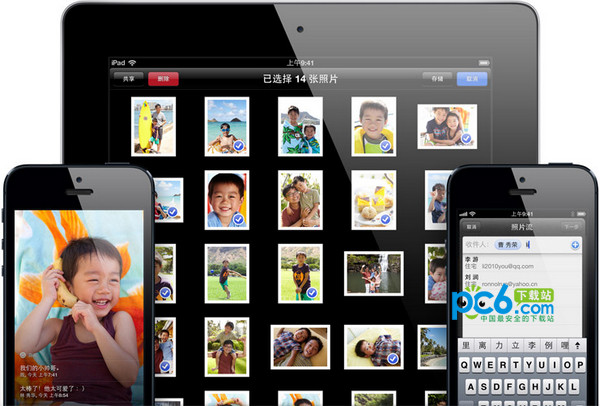 現在,你能與你選擇的人,分享你想分享的照片。只需從照片 app 中選擇照片,再輕點分享按鈕,選擇你想分享照片的對象,照片就發送出去了。在 iOS 6 設備或運行 Mountain Lion 的 Mac 上使用 iCloud 的朋友,可立即在照片 app 或 iPhoto 中收到照片。如果你的親友沒有 Apple 設備,也照樣能在網上浏覽你的照片。大家還可以稱贊或評論每張照片。你能盡情分享照片,因為你的分享照片流不會占用 iCloud 存儲空間,它們是通過 WLAN 和蜂窩數據傳送的。