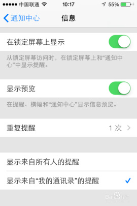 在信息的通知設置中,找到最底部的“顯示來自我的通訊錄的提醒”,點擊勾選,如圖所示: