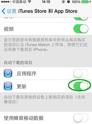 iOS7自動更新功能是一項比較人性化的功能,免得用戶在自己手動進行逐項點擊下載更新或點擊全部更新,現在這個點擊的步驟都給你省卻了。不過為了節省流量,建議把蜂窩數據用於自動下載的按鈕關閉。