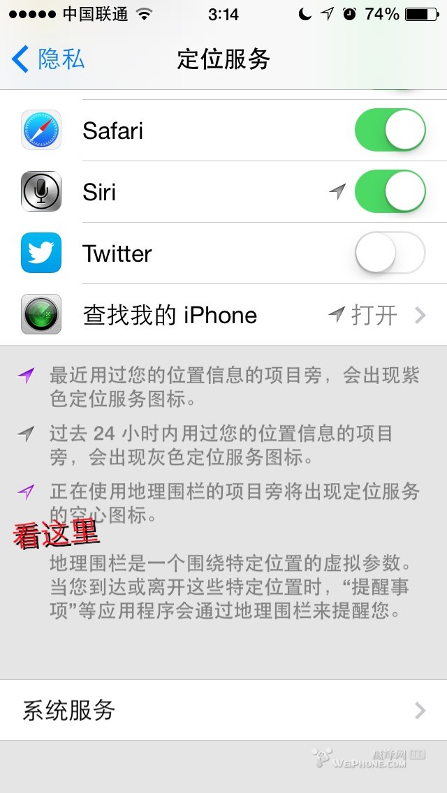 在隱私的定位服務中,特別提到了空心的定位服務標志,稱之為地理圍欄,也就是劃定一定的區域,並且這個在提醒中能夠進行設定,即在你進入或者離開一定的地理區域內,有相應的提醒APP,能夠提醒你,如果在同一個地點發生多個事件需要提醒
