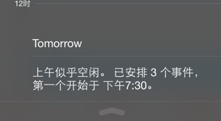 iOS 7 不再是死板地將“天氣、消息”放在一塊黑色的面板上,而是很有語境地向用戶描述今天的天氣如何,感覺像是一位朋友在跟用戶談論天氣。更妙的是關於明天安排的描述。通知中心會根據你明天的日程安排作出一些“評論”.比如,“明天你似乎很忙”“明天上午似乎空閒”.用戶會得到一種安慰,感覺遇到一位理解你的人。老實說,即使是跟你一起生活的人,也不一定能理解你每天有多忙碌。