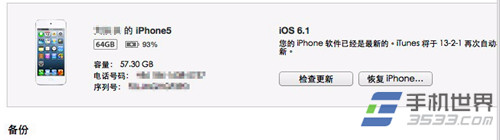 3)在iPhone摘要界面,按住電腦鍵盤上的“shift”鍵,再點擊“檢查更新”按鈕。(如下圖所示)