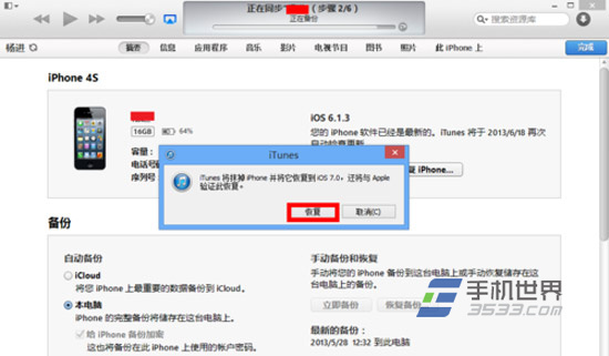 5)接下來iTunes會提示我們將會抹掉一切內容,還將會與Apple服務器驗證恢復,點擊“恢復”按鈕。(如下圖所示)