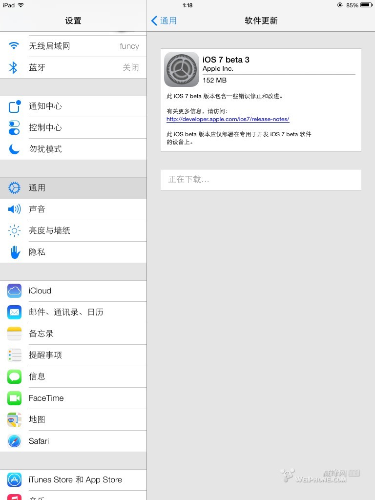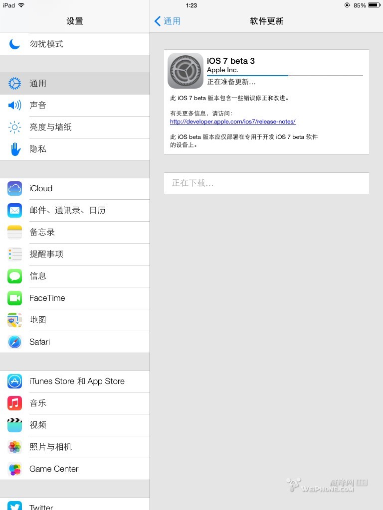 接下來,請准備好已經升級到ios7 beta2 的mini【升級需要您保證您的設備電量在百分之50以上或處於充電狀態】,點擊設置,選擇通用,點擊軟件更新。接下來您會經過如下圖過程: