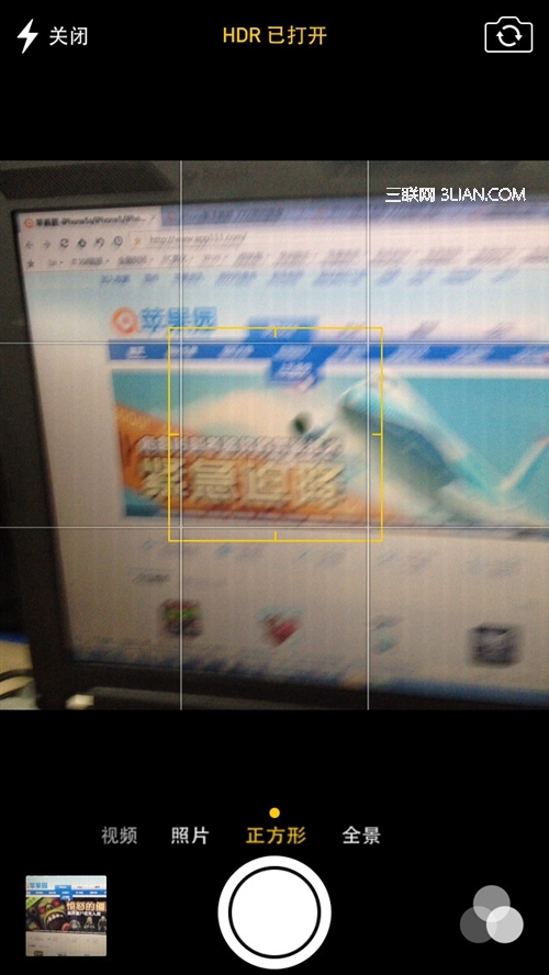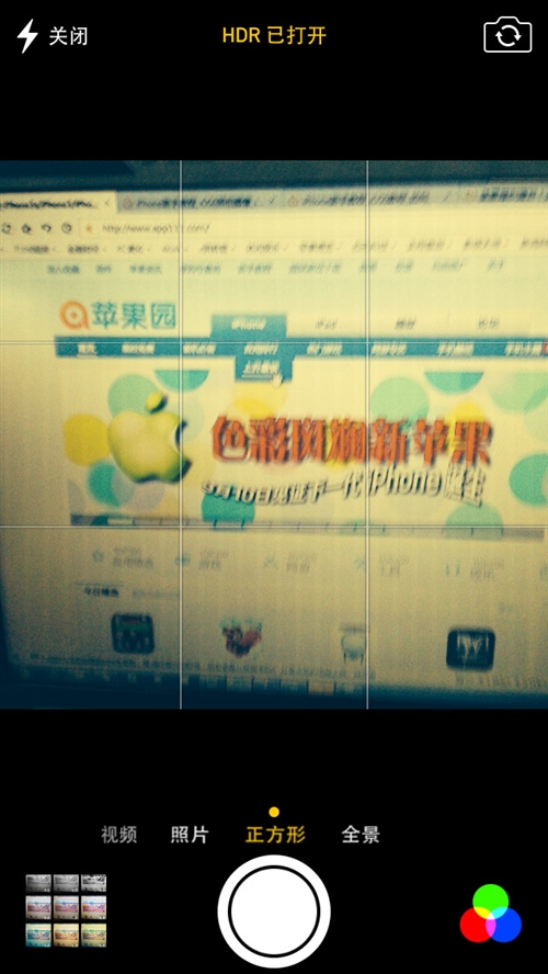 與iOS6和iOS5不同的地方主要是可以滑動切換視頻、正方形取景和全景拍攝模式,右下角的實時特效也是新功能,不過iPhone4是不支持的哦。