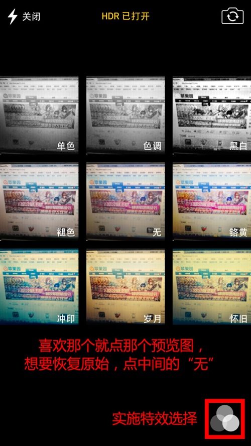 這是實時特效模式,效果很贊,另外當你使用實時特效拍照之後,存儲的照片會根據你所選擇的效果實時改變,不喜歡直接選“無”就是原始照片了,很方便。