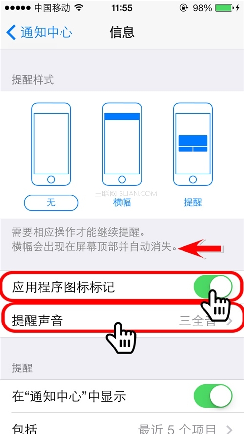 第4步:點擊打開“信息”,在裡面選擇“通知中心”,“通知中心”在默認情況下是開著的,設置關閉通知中心的按鈕,並在“提示樣式”中選擇無。