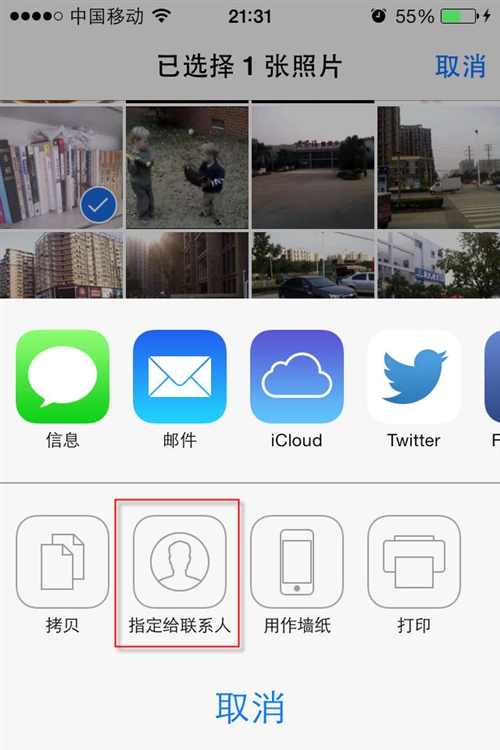 STEP3:點擊“指定給聯系人”圖標,從通訊錄中選定聯系後,會再提示選取你要分享的圖片內容。