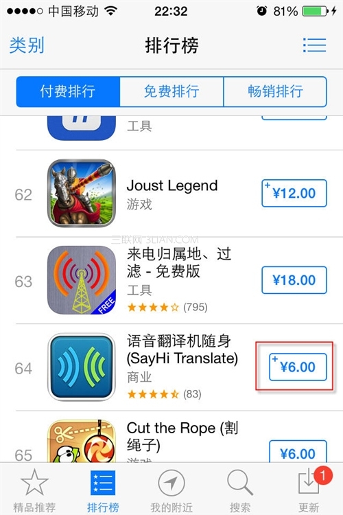 STEP2:隨後你可以通過“精品推薦”或“排行榜”來尋找你希望付費購買的應用資源。找到後可直接點擊其右方的價格按鈕。