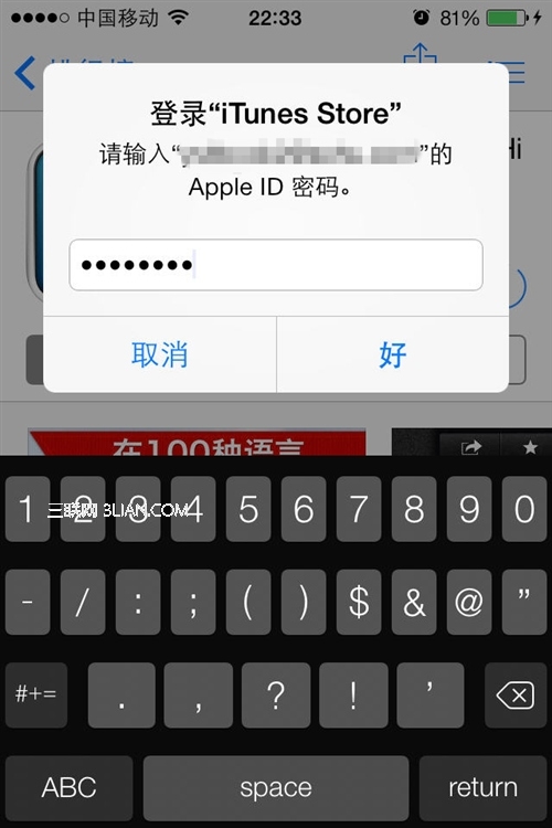 STEP3:點擊價格按鈕後該按鈕會隨即變為“購買”,再次點擊它會後會提示輸入你的蘋果賬戶密碼。