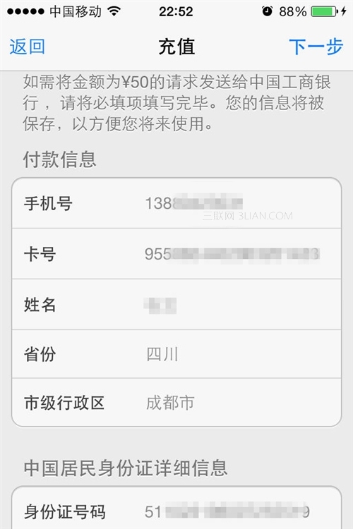 STEP9:蘋果支付通道主要通過中國銀聯。因此接下來會要求你輸入與銀行卡相匹配的相關信息,包括手機號、姓名、身份證號碼以及地址等,請如實填寫這些信息。其中手機號以及身份證號是幫助中國銀聯進行付款驗證的;地址則是方便蘋果寄送相關的賬單信息。