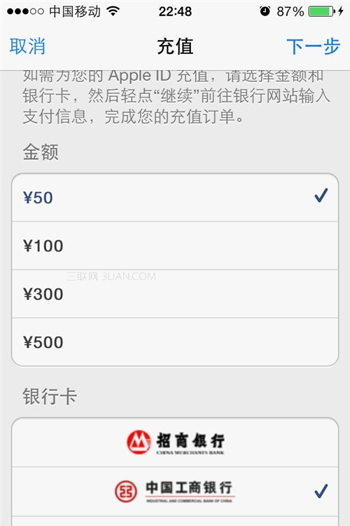 STEP8:接下來會提示選擇充值金額及選擇銀行卡。蘋果的充值金額不能自定義,最低50元人民幣起;銀行卡則支持大部分境內的儲蓄卡和信用卡。