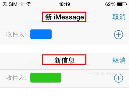 iOS5系統帶來了iMessage功能,如果雙方都打開了,則會自動發送iMessage,而不是發送普通的短信,節省短信費用。打開iMessage的收件人,會顯示藍色;沒有打開的為綠色,如下圖:
