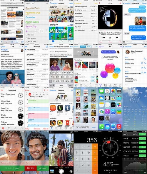 2)iOS 7的一系列應用拼圖,可以發現它在盡可能的情況下趨向相同的屏幕風格。
