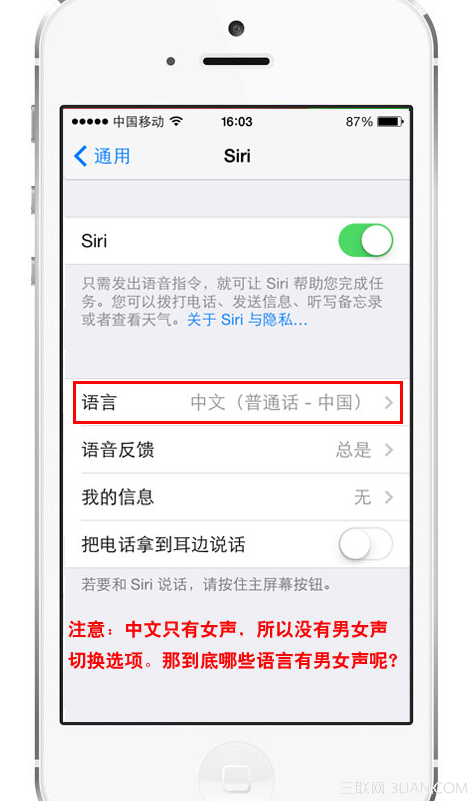 在蘋果移動操作系統iOS7更新中,已為Siri添加了男女聲,不過有許多新手用戶在更換男女聲前發現在設置裡並沒有聲音性別切換選項,這是怎麼一回事呢?蘋果iOS7新增的Siri男女聲切換在哪裡?下面我們就圖解蘋果iOS7新增的Siri男女聲切換,獻給各位可愛的忠誠的“果粉”。