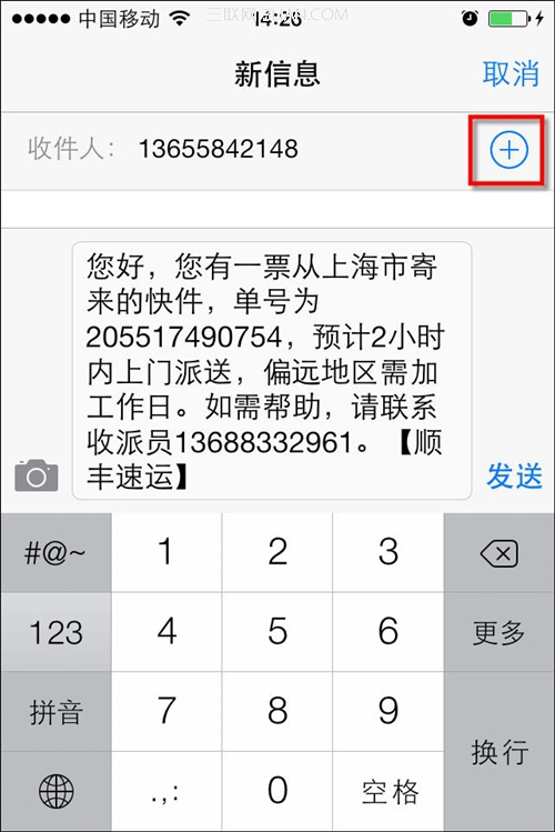 第3步:隨即進入新信息編輯界面,自行輸入或通過右方加號按鈕從通訊錄導入聯系人即可完成轉發。