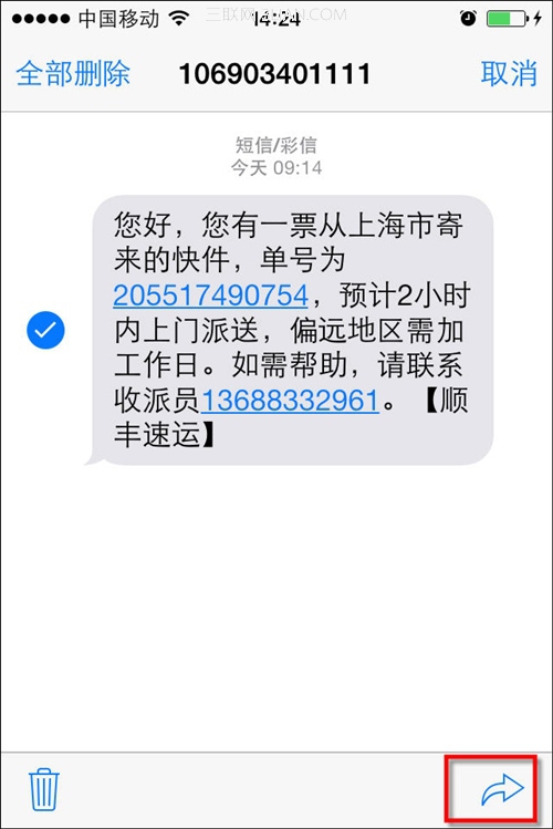 iOS7短信操作界面與以往舊版的iOS系統有些區別。比如當我們要轉發某一條短信時,在iOS7中應該按如下方法進行: