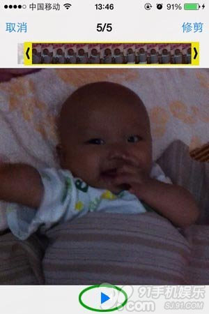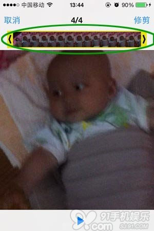 找到需要剪輯的視頻後,輕點iPhone屏幕就可以看到頂部的進度條了,視頻的剪輯功能隱藏得有點深,不要以為該視頻播放頁面只有播放功能,其實是可以進行剪輯的。請留意下圖中的綠色圈圈部分,用手指長按兩側任意一端然後往中間位置拖動一下就會把剪輯功能調取出來了。