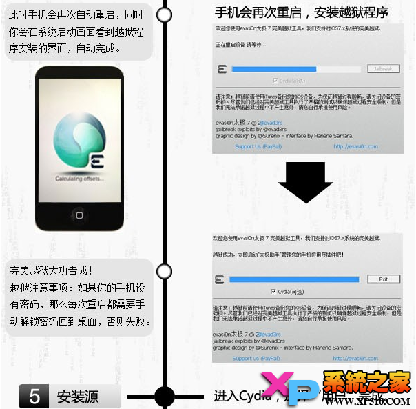 4.如果越獄過程在某個流程卡住了,可以進行以下操作讓程序繼續運行:重啟evasi0n程序,並重啟設備(如果有必要的話,可以同時按住Home鍵和電源鍵,直到設備停止運行)。