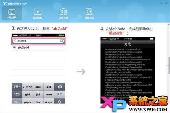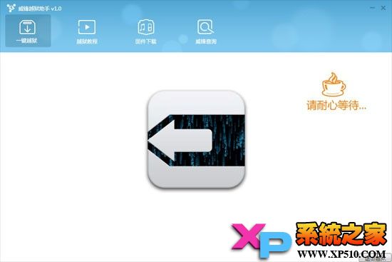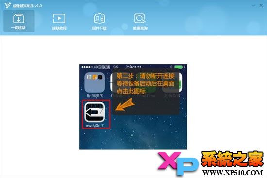 Step 2、當威鋒越獄助手出現如下畫面時,請打開設備,找到如圖越獄圖標,點擊一下,然後不要做任何操作,繼續耐心等待(設備會重啟一次),越獄助手會出現兩次畫面變化,如下圖;