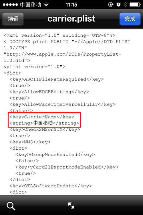 2、運營商圖標修改一般就如下面圖紅色標記所注,只需按照下圖代碼進行相應編輯就能恢復到修改前狀態,也就解決了ios7修改運營商圖標後不能連接蜂窩網絡的問題。