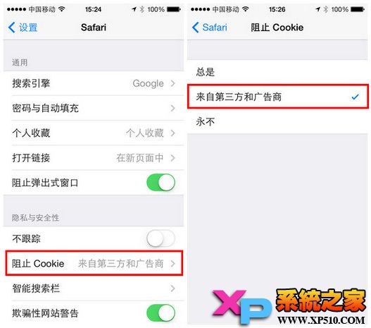 2、選擇“阻止Cookie”,嘗試選擇“來自第三方和廣告商”或者“永不”