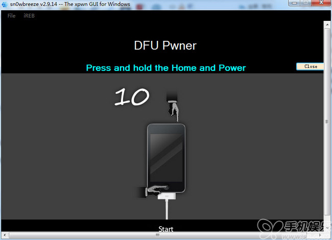 先將iOS設備關機後點擊【sn0wbreeze 雪花】降級工具的【Start】按鈕,然後按照提示步驟操作: