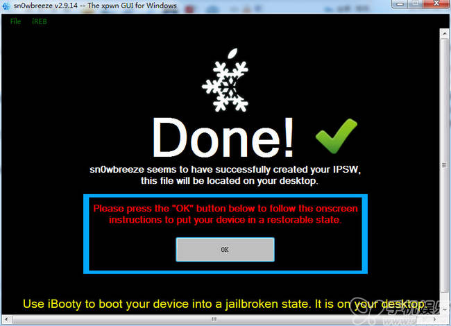 6.制作降級固件成功後將iOS 設備連接電腦並點擊【sn0wbreeze 雪花】降級工具點擊【OK】