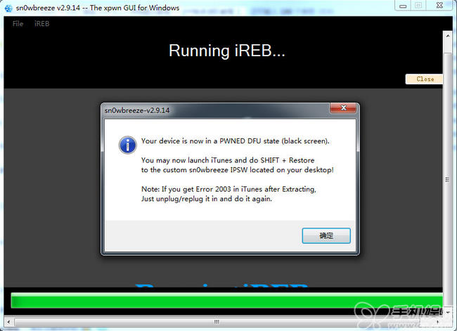 七、【sn0wbreeze 雪花】降級工具成功引導進入DFU模式--點擊確認。