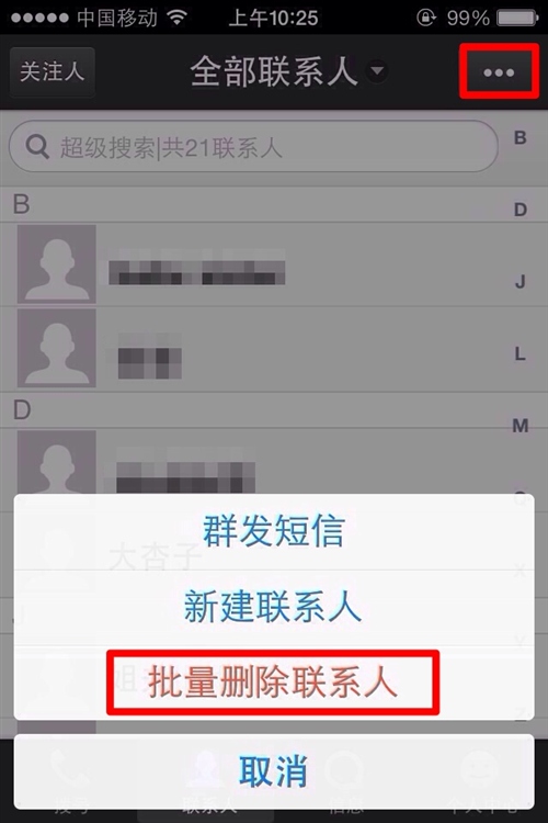 3、點擊右上角的【…】選項框,在彈出的列表中選擇“批量刪除聯系人”;