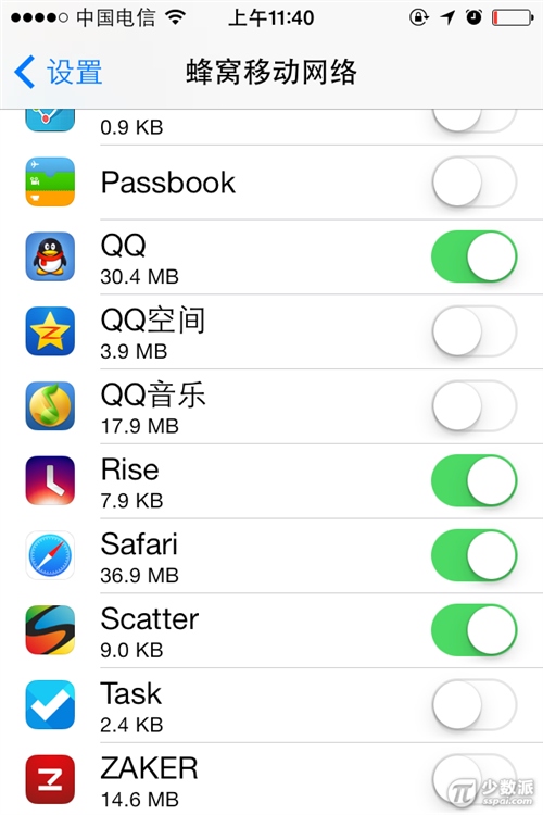 啟動流量消耗清單很簡單,進入“設置--蜂窩移動網絡”即可打開,往下滑動即可見到分類明確的流量消耗情況。在這裡,我們可以很是詳盡了解到設備至今聯網多長時間、一共用了多少流量、每個應用所消耗的流量,一目了然。這個國內用戶最為迫切實用的需求,終於在iOS7實現了!
