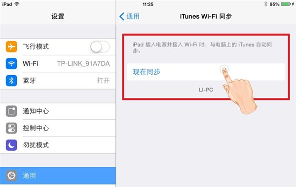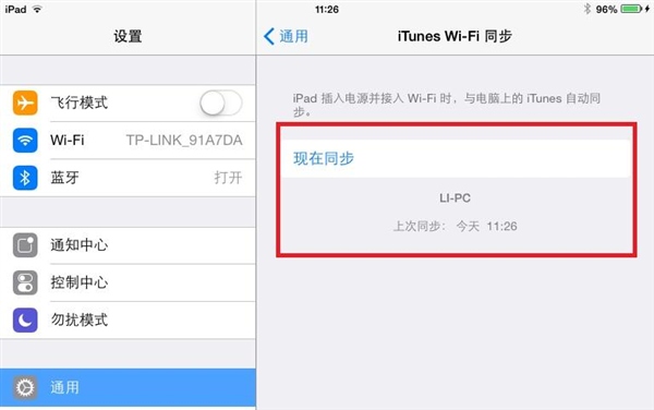 第四步,在打開的窗口中,可以看到提示:當接入Wi-Fi時,會與電腦上的iTunes自動同步。此時可以拔下數據線,點擊“現在同步”按鈕即可進行同步了。